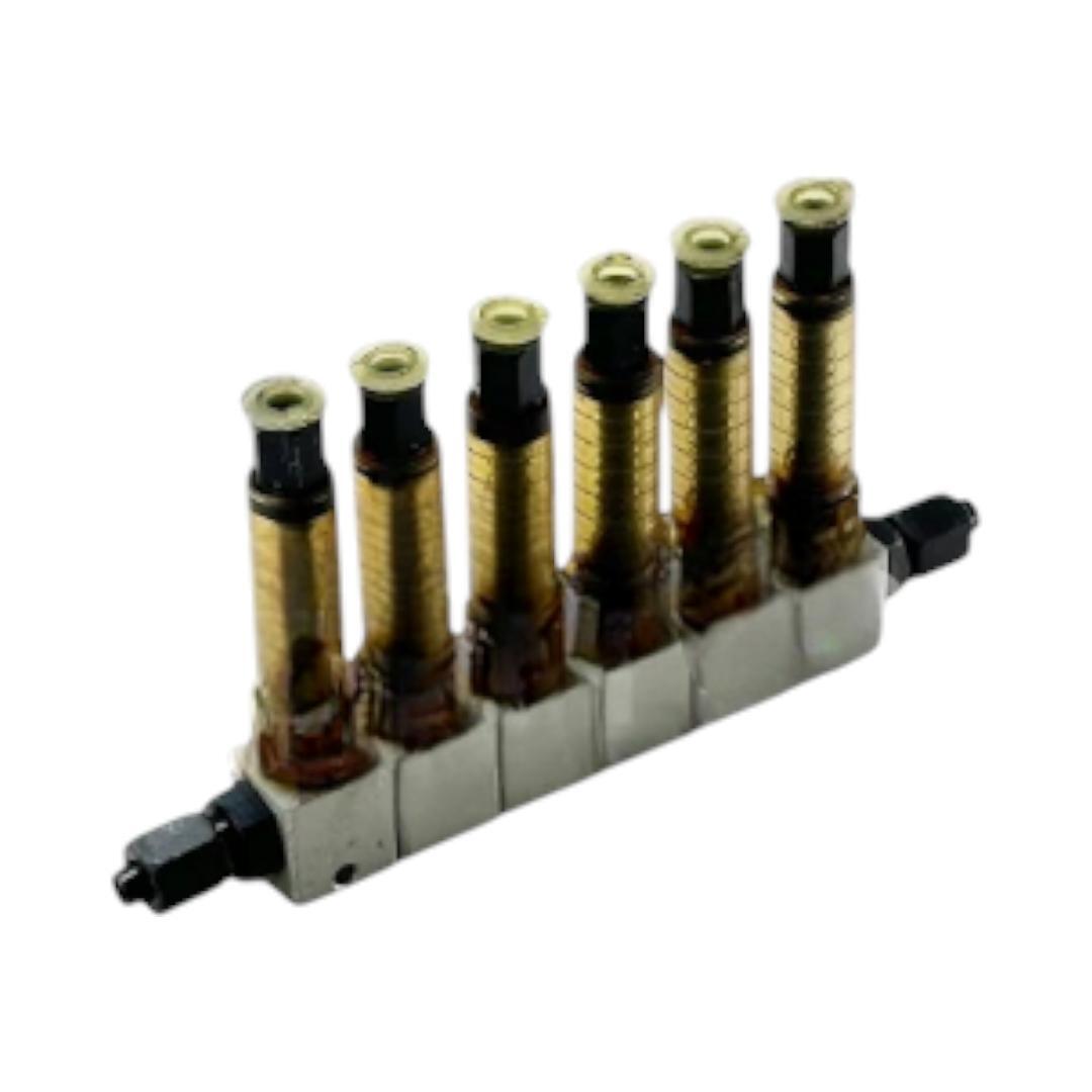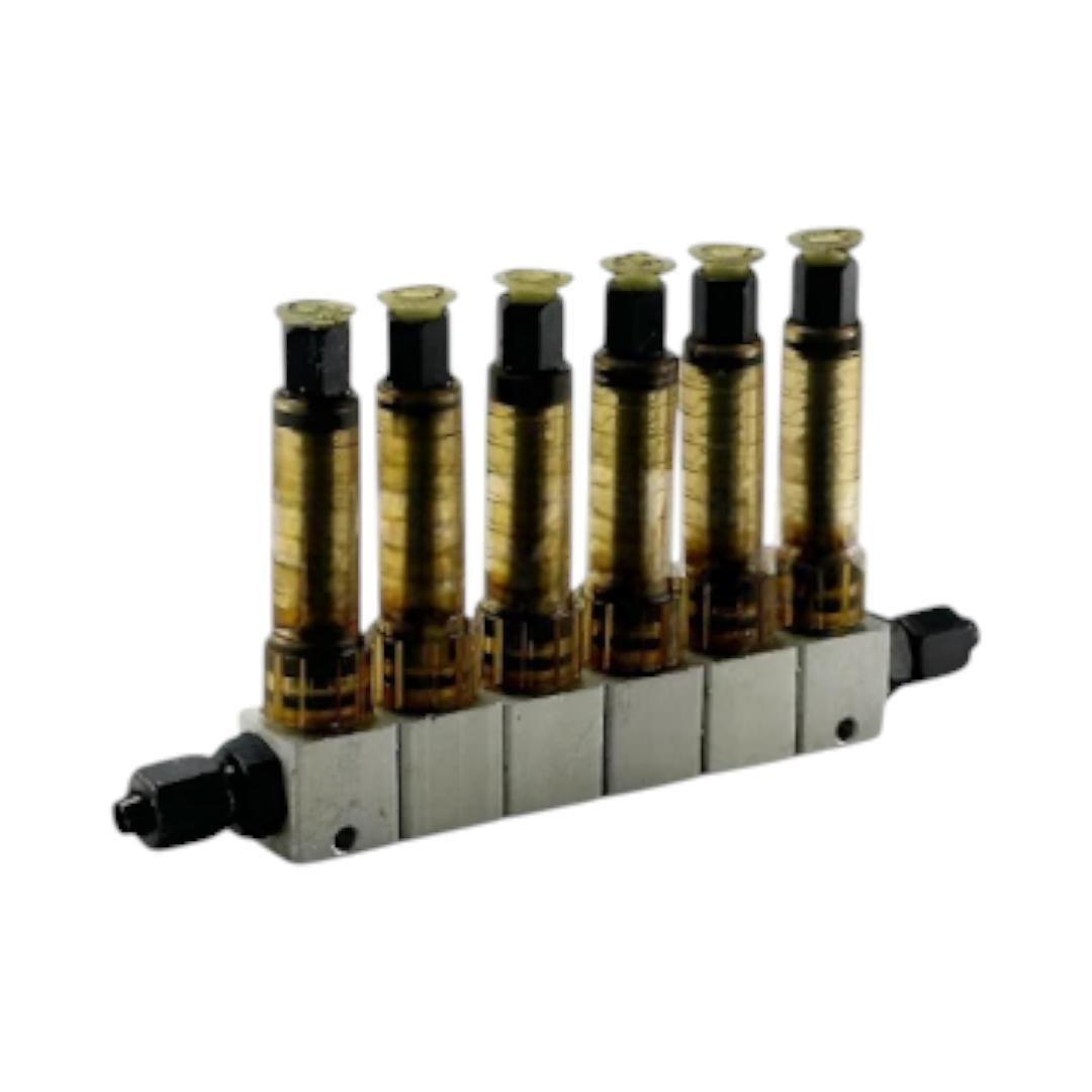 Блок дроссельный БДИ6-1 — специализированное устройство для централизованных смазочных систем, предназначенное для отвода масла, регулировки и визуального контроля его расхода, подаваемого к трущимся поверхностям оборудования. Конструкция блока представляет собой сборку из шести одноотводных модульных секций, объединённых общей шпилькой, каждое с индивидуальной системой плавной регулировки расхода и встроенным указателем.