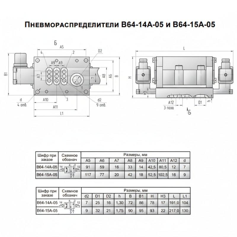 В64-14А-05 110В — четырёхлинейный двухпозиционный пневмораспределитель с электропневматическим управлением